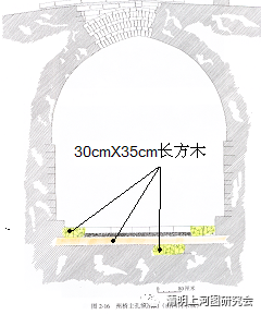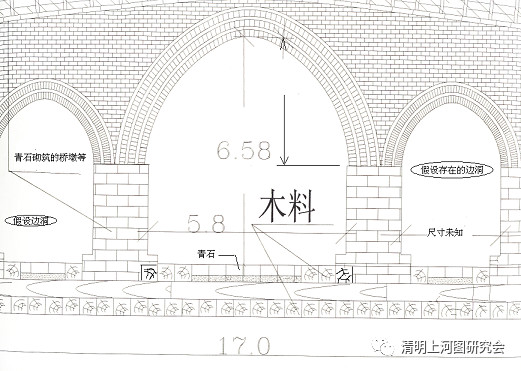 (图1)1984年砖拱“州桥”的初勘剖面图 6、同时,在桥墩下还可见到两层密排的方形长木,上层南北放置,下层东西放置。方形长木宽0.35米,厚0.30米。每层方形长木的实际长度不详。上层南北放置的方形长木直接压在桥墩下,既作为桥墩的基础,也起到桥孔地面垫层的作用。而下层东西向的方形长木,衬垫在上层下且埋在淤泥中。 7、古州桥“试掘简报”认为: 发现的地下古州桥,“可能是明洪武年间重筑开封府城时(约在1378年前后)所修”[1],是“利用了北宋州桥原基,改修了桥墩,增修了桥劵,改棚梁式石桥为砖石结构的拱形桥”[2]。 古州桥是“明末崇祯15年(1642年),明军与李自成交战,扒开黄河淹没开封,州桥亦在这次水患中淤没于地下”[3]。 笔者认为:限于当时条件,初勘实在难以充分了解古州桥情况,上述两条结论也难免存在疑问。比如:砖拱“州桥”桥墩下,若确实叠压着两、三层纵横交错的长方木,它们究竟是宋代州桥的“筏形基础”呢?抑或是宋代州桥的其他“结构物”呢?因为,这两、三层纵横交错的长方木的埋深标高,与宋代汴河河床文化层标高有冲突之问题。从文献推测北宋州桥的“原基”应该是短木打压的“桩基”,不大可能采用平铺的、厚重的“筏基”。就是说对于初勘发现的情况,还有桥梁“构造”方面的未解之谜! 1、认为发现的砖拱“州桥”是在“明末崇祯15年(1642年)”的“水患中淤没于地下”的唯一依据,是明末无名氏的“如梦录”的一句话“桥高水深,船过不去桅”。 2、但是,比无名氏早生百年的开封人李濂,在其《汴京遗迹志》(成书于1546年间)讲“今省城延庆观前有小砖桥 ,汴渠故迹微存,俗名臭河儿”[4]。这证明1546年以前,“州桥”的 桥身就淤没了,不可能在“臭河儿”下游200米,还有座“桥高水深”的“州桥”。如果有,专门研究“汴京遗址”的李濂决不会熟视无睹、不载其著、只字不提! 3、李濂的《汴京遗迹志》还说“洪武三十二年(1399年)黄河泛滥,而河及闸具被湮废”[5],“冲塌土城,水从封丘门流入里城,官廨民庐淹没倾圮”[6]。“天顺五年(1461年),河复决,冲入汴城,宗藩皆避水邻邑”[7],“ 自是(1461年)以后,黄河不入汴城,殆百年矣”[8]。“今(1546年前)南熏门内东西有河弗涸,不复通舟楫矣。是河之上,有东西二桥见存,东曰小桥,直对南熏门,西曰雷家桥在今南察院前 ”[9]。读了李濂如此清晰的史料脉络,如此明白无误的方位记述,充分证明砖拱“州桥”的桥身,早在李濂生前的洪武三十二年(1399年),或者在天顺五年(1461年)就已经淤没地下。无名氏到200年后的“明末崇祯15年(1642年)”之前,还能看到“桥高水深,舟过皆不去桅”, 岂非拙拙怪事?所以,砖拱“州桥”的桥身,不太可能是直到明末崇祯15年(1642年)才淤没地下的。 4、也正因为天顺五年(1461年)黄河再次决口以后,至李濂在世的1566年,“黄河不入汴城,殆百年矣”。其后一直延续到崇帧十四年(1642年)的近二百年间,开封城没有再受到黄河水灾的严重破毁,才造就了“如梦录”描绘的开封城的繁荣景象。据此推断,该砖拱“州桥”桥身淤没于地下,至今不止是370年而至少应当是550年了。 5、1984年的勘探已证明“州桥”孔洞高6.58米,桥墩直墙仅2.88米,按水深2米计,水面以上净空,是个很狭窄的半圆孔洞。不要说“舟过皆不去桅”,连行漕船的条件都不具备。另外,史称早在“元世祖至元27年(1160年)河决,自汴城迤东至陈留、杞县,汴河及堤皆为所淤”[10]。显而易见,开封城内的汴河处于上游,应是在1160年就已经不可能通航,仅有城内排水的作用而已。 6、“如梦录”中的说法,为何令人误判了呢?细读“如梦录”中“桥高水深,舟过皆不去桅,最宜月夜,汴京八景之一,所谓州桥明月也”[11]整段话的行文语气可知,它只是对北宋汴京八景关于州桥“传说”的泛泛而谈。无名氏并非是说亲眼目睹,依实记述。不难判断,这必定是“如梦录”有脱字之误,在这段话前面,如校勘补入“曩时”二字,自然就文通意顺,毫无歧义了。意即,“过去”的州桥“桥高水深,为“汴京八景之一”。(况且,宋人“东京梦华录”说“其桥与相国寺桥,皆低平不通舟船”[12],到了明末,怎么反而会“桥高水深,舟过皆不去桅”?) 1、1984年发现的砖拱“州桥”与宋代“桥下密排石柱”的那座平桥完全不同,推测它为“明代”的州桥没有问题。 那么,明代的砖拱州桥的基本构造大概是什么样子呢?(参见图2)