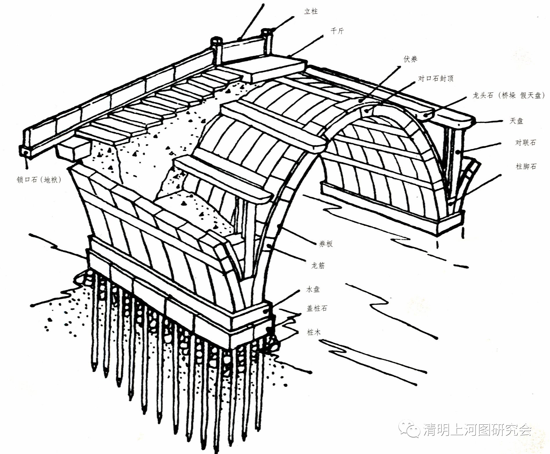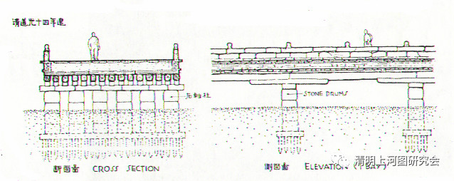 (图2,砖石拱桥结构透视图) 因为,古州桥初勘仅仅能从桥面“钻孔”进入拱劵内部,不可能看到埋在路面一下的桥身。所以,古州桥是单孔还是三孔不得而知,两侧栏杆是石材雕刻,还是砖石砌筑均不可知。但是,已经发现的古州桥,结构就是这个样子。 2、而文献记载,宋代州桥是“桥下密排石柱”的“低平不通舟船”的平桥。那么,“平桥”指其形,“密排石柱”指其承重体系。如果其上部也全是“石梁、石板”的桥面,就是真正的棚梁式“石桥”。宋代州桥的“桥面”究竟是什么材料铺就的呢? 据《东京梦华录》说,(州)“桥之西有方浅船二只,头置巨幹铁枪数条,岸上有铁索三条,遇夜绞上水面,盖防遗火舟船矣”[13]。这些史料说明什么?宋人为什么搞这一套设施呢?原来,宋人担心州桥以西的舟船“遗火”后顺流而下,卡到“密排石柱”上烧毁上部的桥面。所以,设置了白天用“巨幹铁枪”拖拽,夜间用“铁索”拦挡等防止次生火灾的消防措施。 据此证明,宋代州桥必然是密排石柱支撑的“木梁桥面”。它应当类似(图3)照片的古桥: (图3,石柱木棚梁平桥照片) 3、那么,密排石柱支撑的、宋代州桥的“原基”,又会是什么构造形式呢?从梁思成先生绘制的此类桥梁的纵横剖面图,我们就能大体认知。