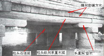 (图4,石柱木棚梁平桥纵横截面图) 不难看出: a、石柱柱头上,横向布置短石梁,其上是纵向承重的木梁。 b、 在纵向承重的木梁上,密铺横向布置的方木结构层。然后,上面可再继续纵、横交错地铺设方木(或木板),以及路面层等,从而组成完整的“桥面”。 c、至于每个石柱下,一般采用“垂直”打入河槽泥土中的木桩基,既便于施工,又能保证石柱的稳定性。显而易见,1984年初勘到的“直接压在桥墩下”及下面“ 两层密排的方形长木方”,不大可能是宋州桥“密排石柱”的“原基”。 1、众所周知,从北宋亡到明朝兴,数百年的漫漫历史中,开封城与众不同的,就是因黄河水患而屡毁屡建,在原来的城址上“层层叠压”。同样,“州桥”也是在完全相同的位置上,随着汴河淤塞而淤没,淤没后在新的标高上再重建。据《试掘简报》,古州桥的“桥面”埋于现代路面4.3米以下, 砖劵厚1米,孔高6.58米,就是说现代路面以下11.88米是拱桥桥墩的“桥基”。开封考古界认为,宋代地面标高一般在地下10米左右。现代中山路路面高于周边地面,古拱桥的桥墩,相当于压在北宋州桥的“桥面”上。 2、加之,宋代“密排石柱”柱基的合理做法,是短木桩基而不应是“茷基”。砖拱“州桥”桥墩下压着的两、三层长方木,也许就是宋代木梁结构之“桥面”。所以, 假设当北宋州桥完全淤没在河泥中以后,明代人重新建桥时,必然会挖到北宋州桥的“方木”铺设的桥面。这时会出现什么情况呢? a、新建砖拱桥墩时,把压在桥墩下和靠近桥墩的方形长木“留下未动”,中间的方木全部拆掉换成石板(否则,东西向长方木会被顺水冲走)。所以,“ 桥孔地面垫层”才成了两边是“两排方形长木”中间是石板的样子。实际上,它们就是北宋“木结构”桥面的最上一层。 b、压在桥墩下“南北放置”的上层方形长木和 下一层“东西向”交错放置的长方木,因实际是“桥面”另两层长方木。也就无需拆除,把它们整体上当作了砖拱州桥的基础。这样,在泥水中既便于施工,又非常的坚固可靠。 c、如果它们不是“桥面”的长方木,那么,最下层的“东西向”长方木,直接铺在淤泥里,下部又没支撑,根本就不能有效受力,白白浪费。宋人再富有,再傻,也不会把厚达60-90公分,约数百立方的长方木做成如此“筏基”,出现在明代砖拱桥的桥墩下。