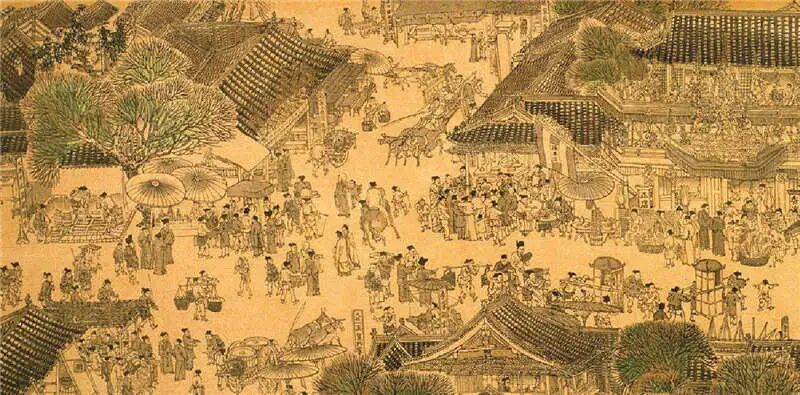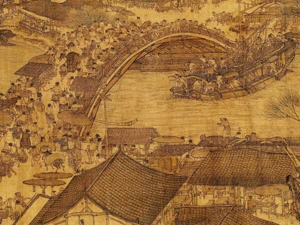 《清明上河图》首段,起于卷首止于大河前端,约占全图五分之一强。此段画面,平林漠漠,农舍数间,小路蜿蜒,行旅匆匆;小河静流,平船待渡;远处是规整的农田,近处是闲处的农夫。张择端所绘无疑是一派农村景象。关于此农村景象,处于东京城何方,历来说法不一,其一,以为是东京外城内东声部地域;其二,以为是东京城外七里之虹桥以东地域。笔者以为前说,与北宋东京外城内东南部状况,舛违甚多,颇难成立,试言之如次。其一,北宋东京外城内东南部地域,东起外城东壁,西至御街;南起外城南壁,北至汴河南岸,是开封府城南左军厢辖地。开封府在此地域内设置大宁、崇礼、广济、敦教、建宁、普惠、永和等七坊。此处,在宋真宗时已地处要会,至北宋末年,则更当为繁盛之地,绝非农村田园之地。其二,此地域内,北宋政府设置有若干官府衙门,有大型国家仓库、有贡院、什部贡院、聿营务等众多官司衙门①。其三,此地域内有众多寺观。大宁坊有兴国院②,东水门里有醴泉观,东水门南有开封著名的繁台天清寺等。其四,此地域内除汴河、蔡河外,尚于小河。凡此种种,以写实手法作《清明上河图》的张择端却全然未将上述状况采入画中,不能说是作者的疏忽,只能表明张择端所取场景并非此地域风貌。上述尚仅就此地域具体状况而论,若从北宋东京城整体状况来考察,则更知此地域绝非农村。北宋后期,东京人口至少已达130万,居当时世界城市之首。同时城市商品经济十分繁盛。因此,北宋东京城内部是十分拥挤不堪的。达官贵人之居,有“前厅仅可旋马”者,有居于隘巷不可通车者③。官僚尚且如此,一般百姓就可想见了。为改善居住状况,致有盗凿河堤“以自广者”④。《清明上河图》所绘东京城内街巷均蜿蜒狭窄,街道两旁店肆民居一栋—栋,正是东京城市建筑物拥挤的写实。关于后说,笔者基本同意,然指实为虹桥以东之地域,则感论据不足。笔者以为《清明上河图》首段所描绘的地理环境,应为北宋东京城外东南之农村。《清明上河图》中段,起于大河前端止于木制单孔桥,约占全画五分之二。全段以一条大河贯通,河两岸街巷蜿蜒,店肆民居栉比。河上有木制单孔拱桥一座,桥上摊贩喧哗、行人接踵;桥下一只重载漕船,正紧张收桅过挢。张择端在此段所描绘的单孔木桥,形如飞虹。据《东京梦华录》载,唯汴河有三座,即外城外东南七里的虹桥,里城外东南的上下土桥⑤。张择端所绘为何,历来论者各说不一,或虹桥,或上土桥,或下土桥,皆言之有理。笔者以为,细观《清明上河图》,并结合对北宋东京城市结构的考订,似可指实此桥为上土桥,其桥附近为汴阳坊所辖管区。汴河在东水门以西一段,是一直经北而去的,至下土桥后,方转西北,历上土桥后,才经直西去。而汴阳坊,顾名思义当在汴河北岸。又据《宋会要•方域•东京杂录》载,汴阳坊属城东左军厢。上土桥附近应为汴阳坊所辖地域。张择端作此段,以图观之,是立于汴河南岸,取景于汴河北岸的。其所绘汴河流向及木制单孔拱桥与汴河在上下王桥之间的实际流向及汴阳坊地理位置正相吻合。故笔者以为,此段在东京的地理位置,似应为下土桥至上土桥西汴阳坊一带地域。